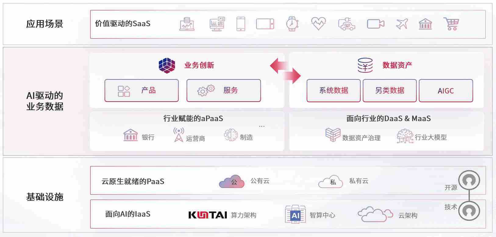 数字时代,,,,围绕企业数字化转型的关键要素,,,Z6尊龙数码开创性的提出数云融合战略和技术体系框架,,,,着力在云原生、、数字原生、、、AI原生和信创产业上架构产品和服务能力,,,,为处在不同数字化转型阶段的快消零售、、汽车、、、、金融、、医疗、、政企、、、、教育、、运营商等行业客户提供泛在的敏捷IT能力和融合的数据驱动能力,,,构建跨界融合创新的数字业务场景和新业务模式,,助力企业级客户建立面向未来的核心能力和竞争优势,,,全面推动社会的数字化、、、、智能化转型升级。。。。