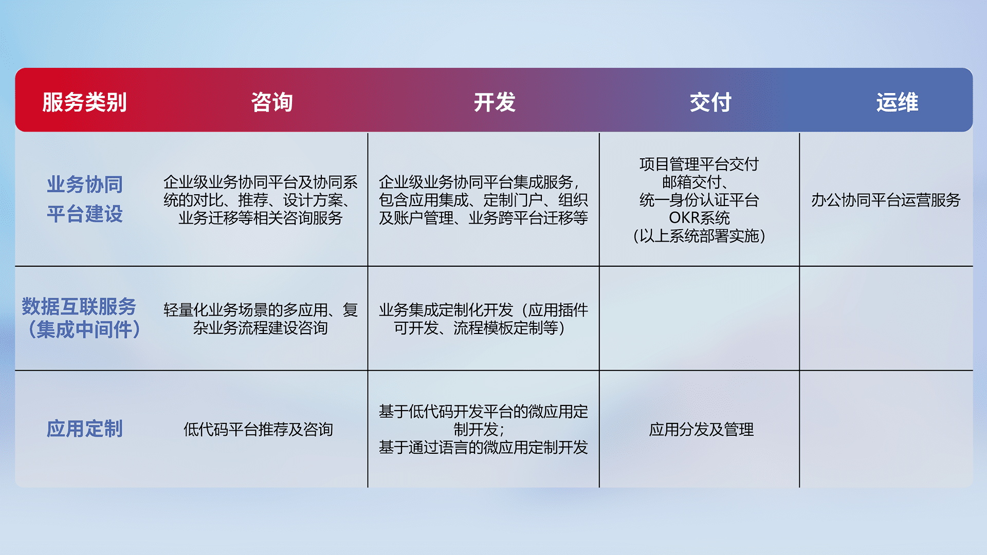 针对钉钉、、、企微、、、、IDaas等平台级产品提供产品的规划、、方案、、、交付、、、、定制化开发等服务,,,实现如统一协同办公、、、、智能客户服务、、混合会议管理、、、智能数据查询、、、、等业务场景,,实现数字化转型。。