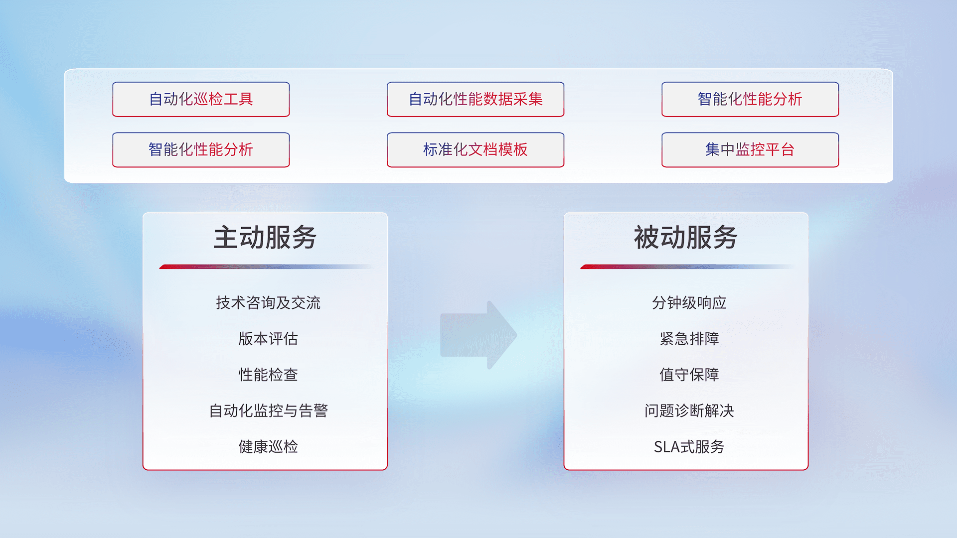 智能化工具和标准化文档,,保障服务质量,,,提供主动服务(包含技术咨询、、、、版本评估、、、、性能检查、、、、自动化监控与告警、、健康巡检)和被动服务包含(分钟级响应、、、、紧急排障、、、值守保障、、、、问题诊断解决、、SLA服务)。。。